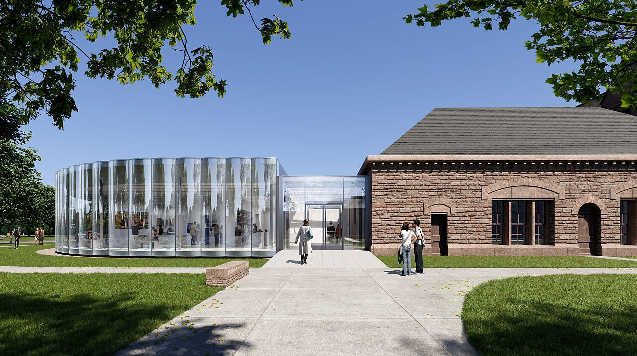 The new LACB pavilion has been conceived in conversation with two of the great historical figures in American architecture: H.H. Richardson and F.L. Olmsted. The building is conceived as a “mirage”, with a unique system of 18’ tall scalloped glass panels that accentuate Richardson’s historic masonry structure, and function as an “optical device” that gradually reveals Olmsted’s rhythmic landscape. (Höweler + Yoon)
