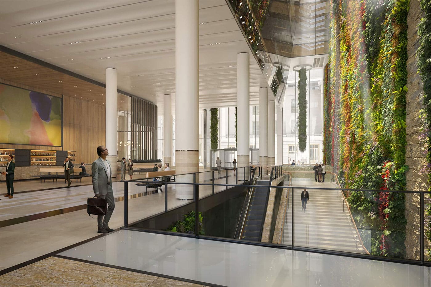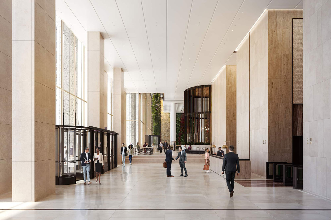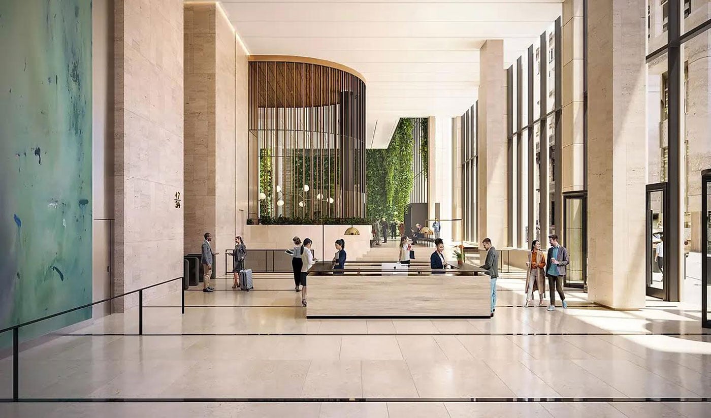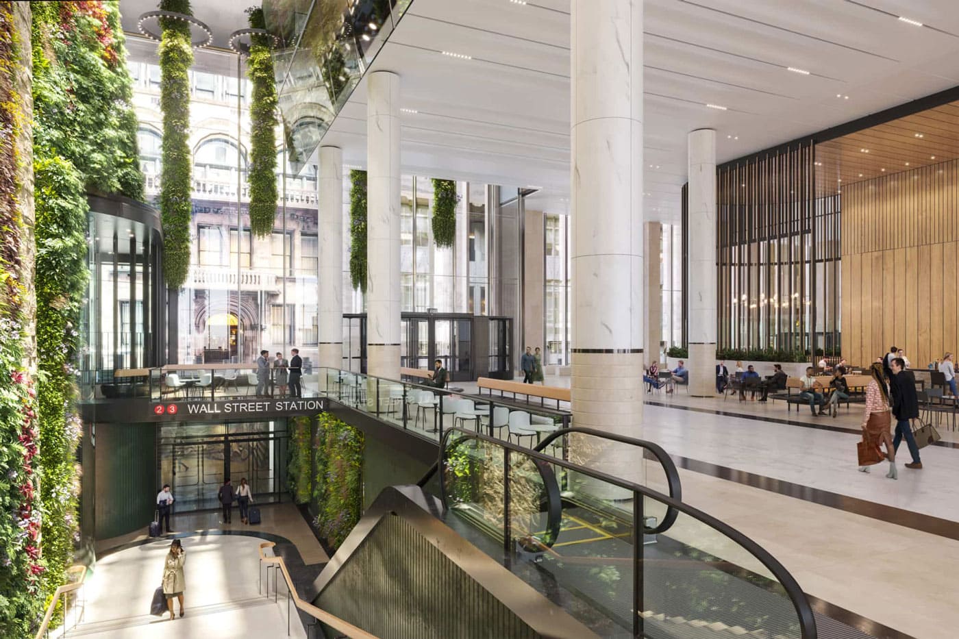 The repositioning of 60 Wall Street significantly redefines the experience for both visitors and tenants by transforming the ground floor of the 47-story, 1.6 million sq ft office tower. The renovation introduces a spacious public atrium, two new lobbies, and a redesigned podium exterior, all directly connected to the New York City Subway at Pine Street via a grand staircase. A defining feature of the transformed space is a 100-ft interior green wall—the largest of its kind in North America—that spans the full length of the block, enhancing the environment with natural elements. The redesigned Privately Owned Public Space (POPS) now functions as a key pedestrian link to the historic district, offering covered access from the subway. A new skylight above the atrium brings in natural light and visually connects the space to the trading floors above, while amenities such as a restaurant and café support a renewed sense of community in the neighborhood. New glazing, supported by glass fins spanning up to 50 ft, is featured, along with a mullionless and sloped fire rated glass wall overlooking the POPS space and green wall.