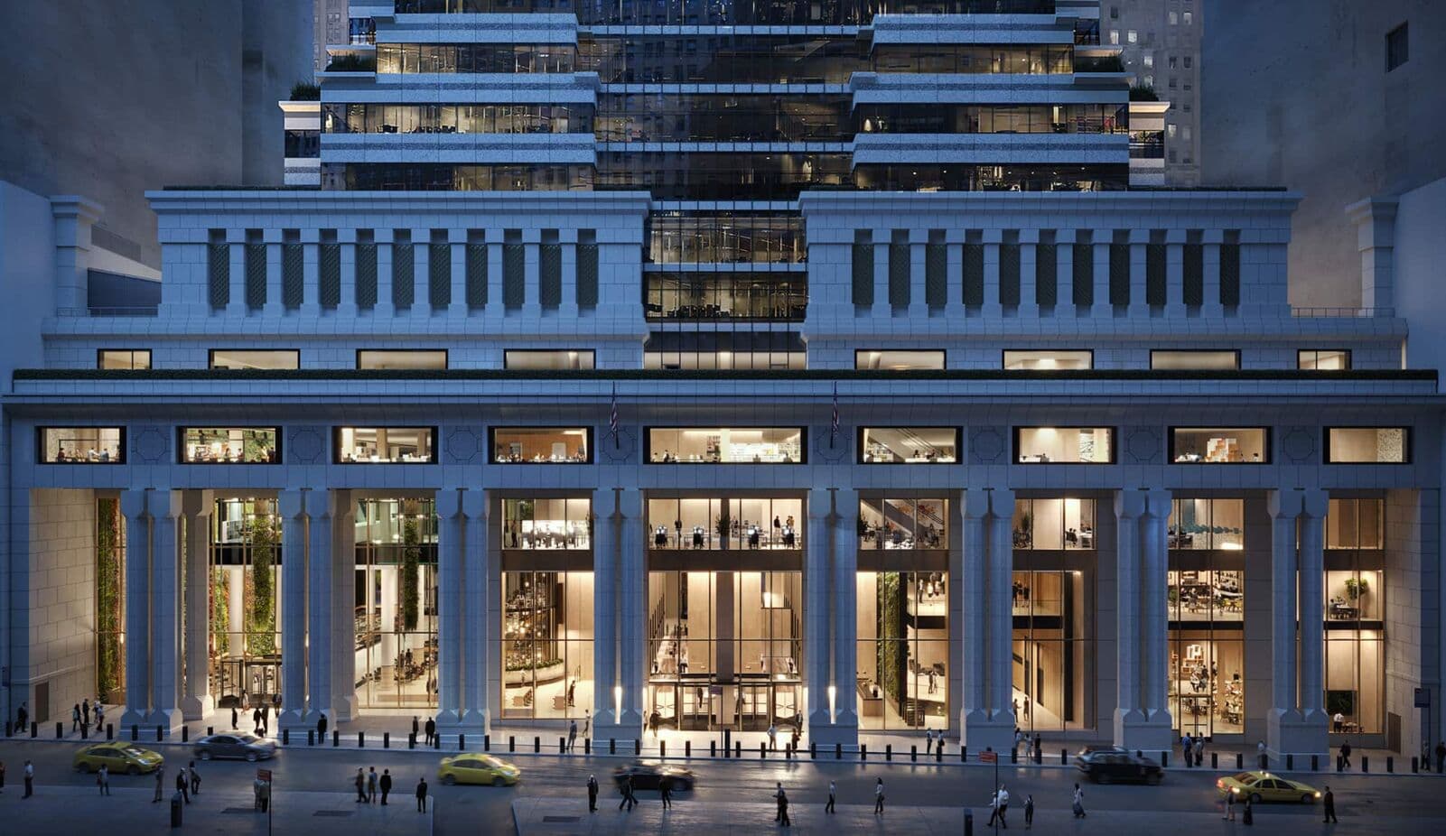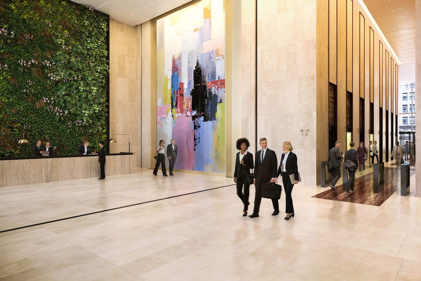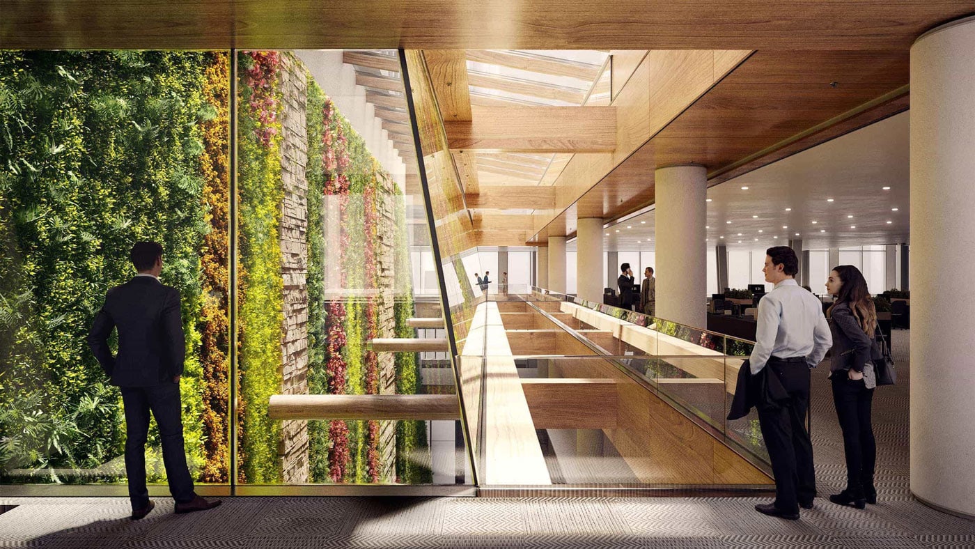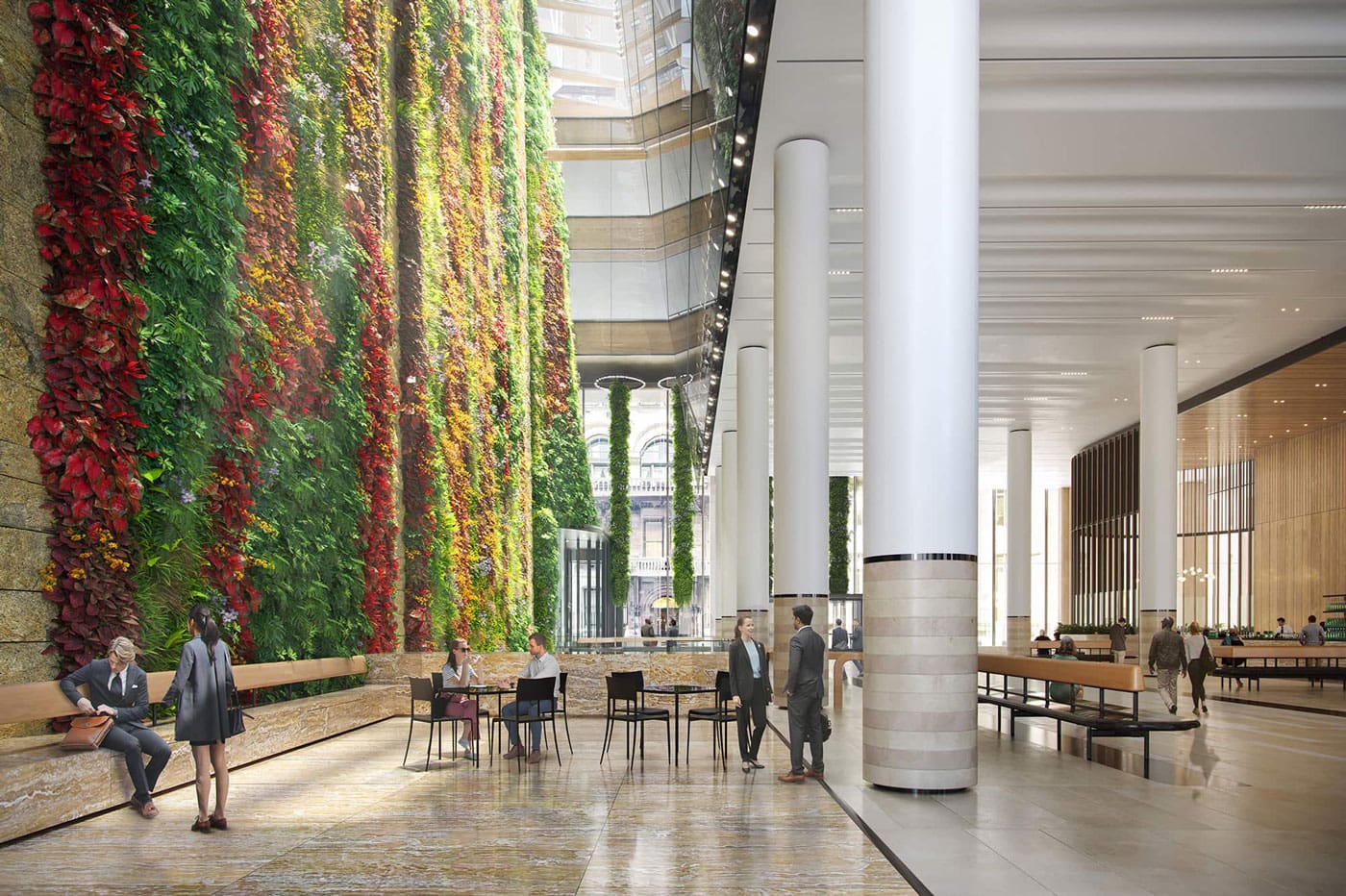 The repositioning of 60 Wall Street significantly redefines the experience for both visitors and tenants by transforming the ground floor of the 47-story, 1.6 million sq ft office tower. The renovation introduces a spacious public atrium, two new lobbies, and a redesigned podium exterior, all directly connected to the New York City Subway at Pine Street via a grand staircase. A defining feature of the transformed space is a 100-ft interior green wall—the largest of its kind in North America—that spans the full length of the block, enhancing the environment with natural elements. The redesigned Privately Owned Public Space (POPS) now functions as a key pedestrian link to the historic district, offering covered access from the subway. A new skylight above the atrium brings in natural light and visually connects the space to the trading floors above, while amenities such as a restaurant and café support a renewed sense of community in the neighborhood. New glazing, supported by glass fins spanning up to 50 ft, is featured, along with a mullionless and sloped fire rated glass wall overlooking the POPS space and green wall.