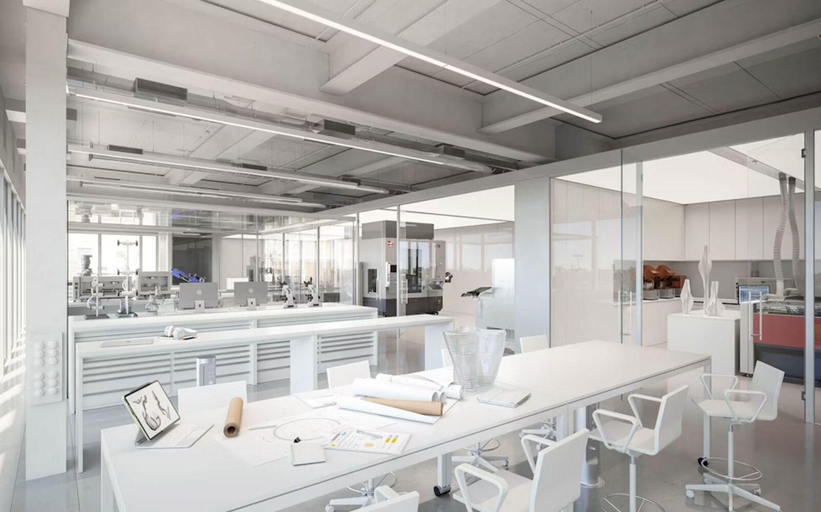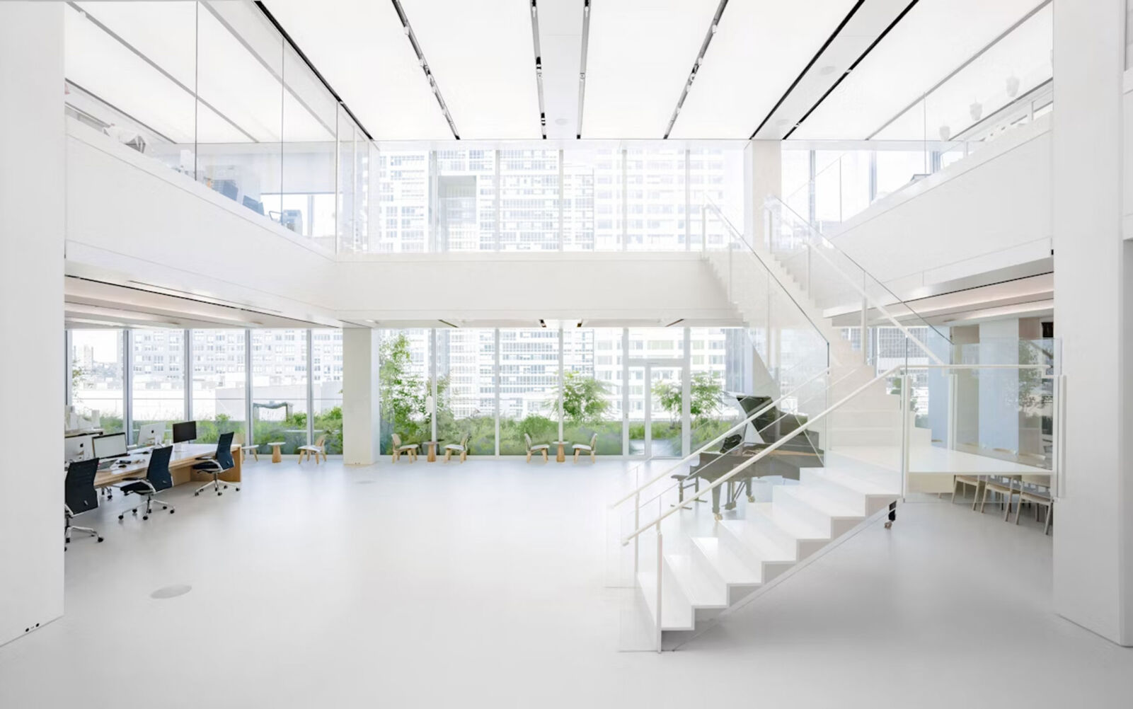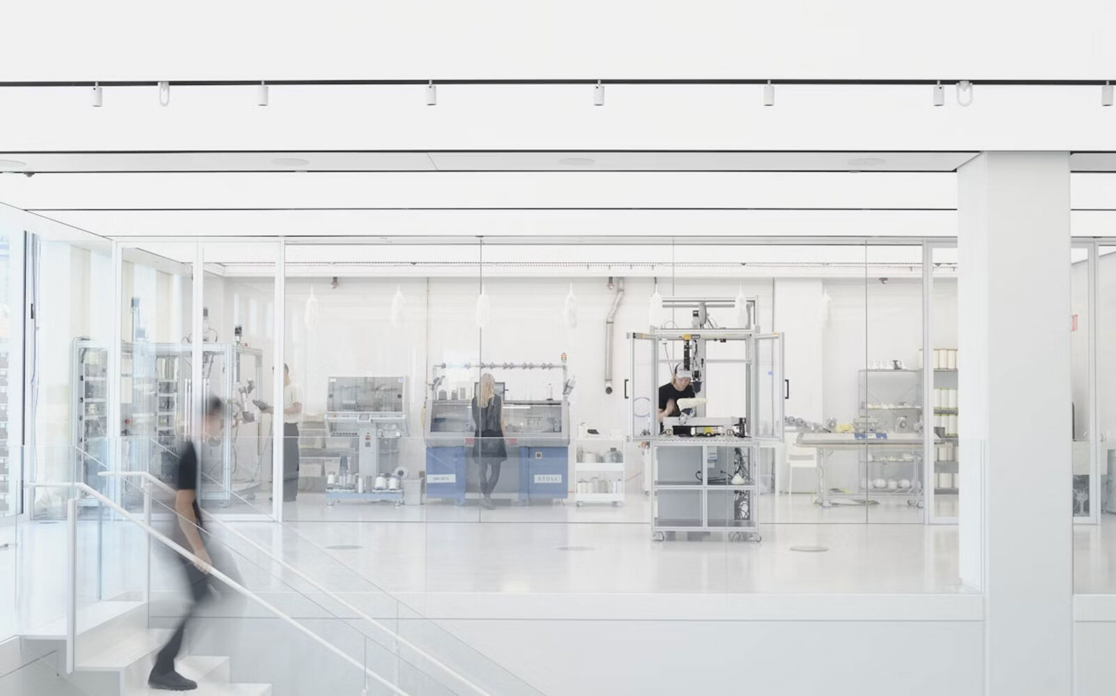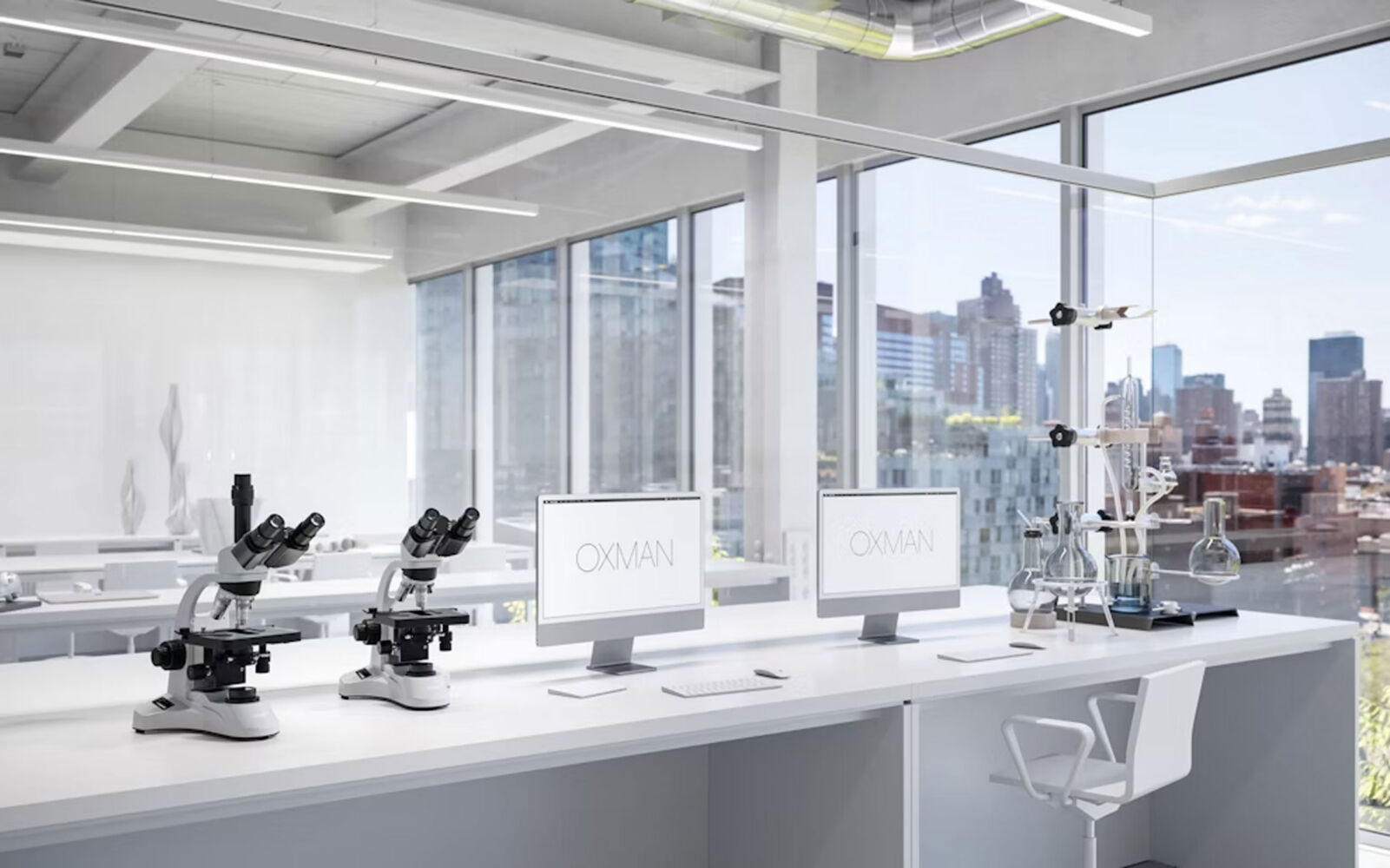 OXMAN Studio, founded by Neri Oxman, is a 36,000 sq ft, two-story space in Midtown Manhattan that integrates studio, production workshop, and laboratory functions. Designed to be highly adaptable and flexible, the space supports a multi-disciplinary, research-based practice combining architecture, design, biology, and technology. Its open floor plan, with glass wall divisions, encourages collaboration among designers, scientists, architects, and other staff members. The space is organized around a central atrium featuring a floating metal and glass staircase. Each of the two levels has its own distinct character and function. The lower floor houses design offices, a library, a reception area, and a kitchen, while the upper floor includes a Biosafety Level 2 wet lab and a production studio that includes a robotics lab.