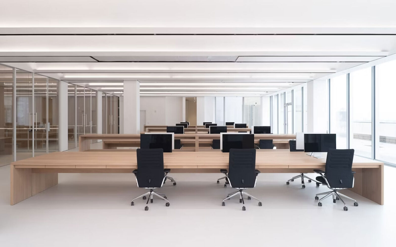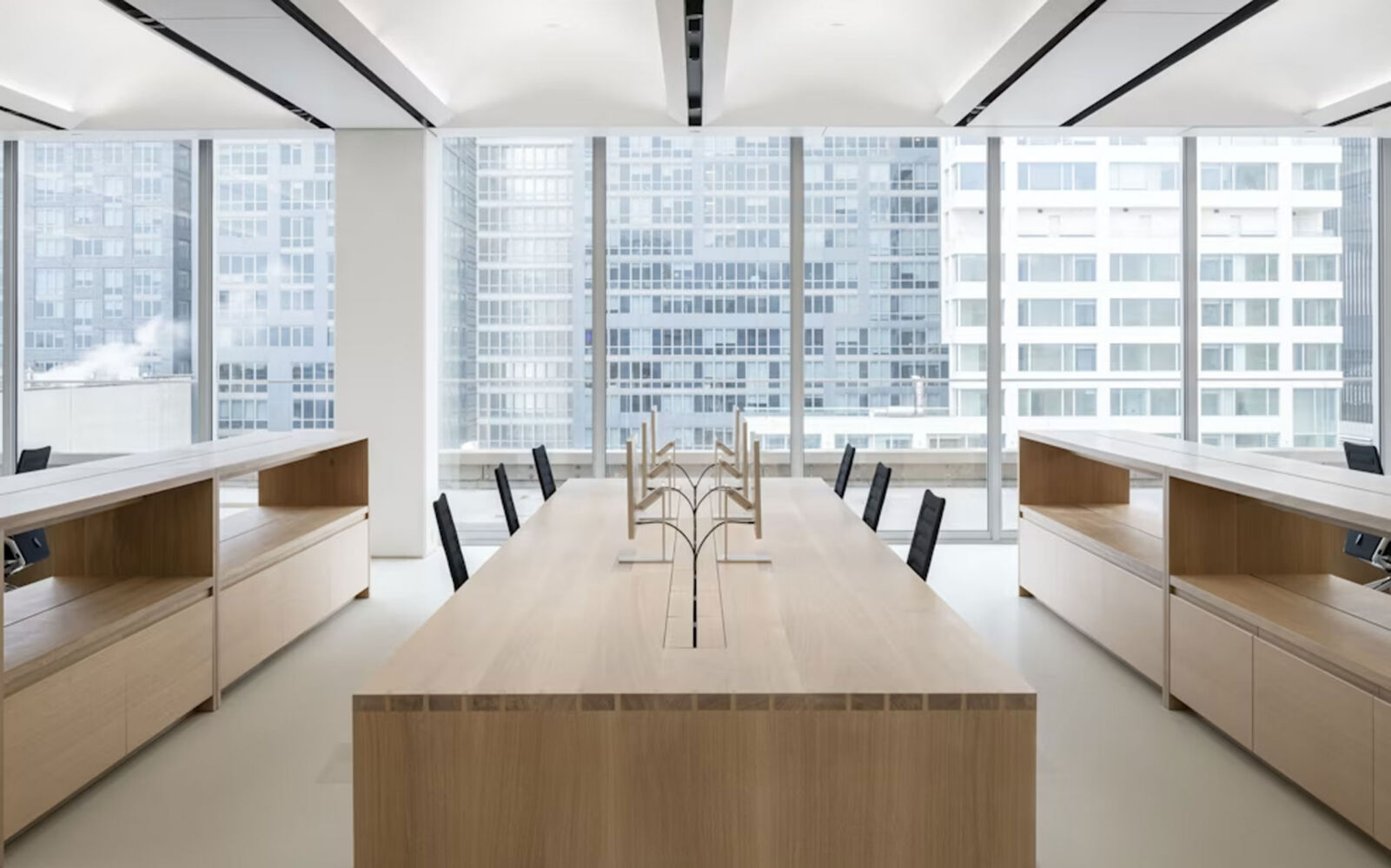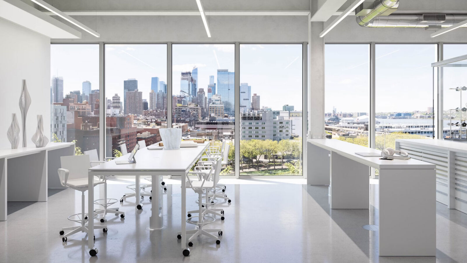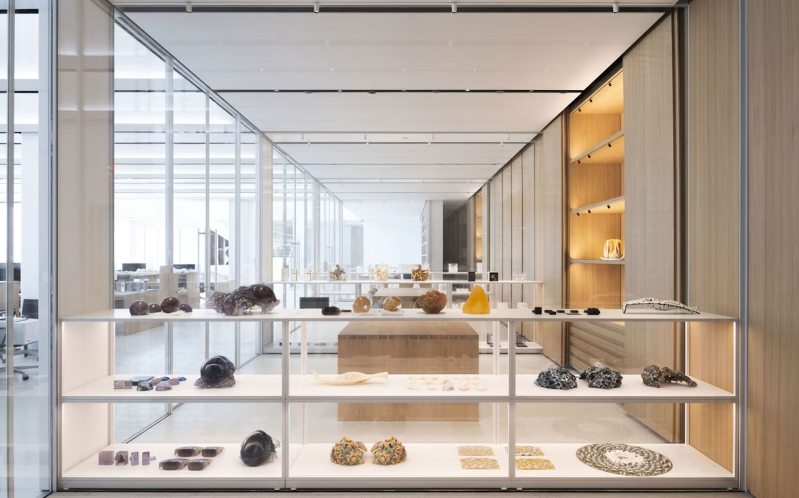 OXMAN Studio, founded by Neri Oxman, is a 36,000 sq ft, two-story space in Midtown Manhattan that integrates studio, production workshop, and laboratory functions. Designed to be highly adaptable and flexible, the space supports a multi-disciplinary, research-based practice combining architecture, design, biology, and technology. Its open floor plan, with glass wall divisions, encourages collaboration among designers, scientists, architects, and other staff members. The space is organized around a central atrium featuring a floating metal and glass staircase. Each of the two levels has its own distinct character and function. The lower floor houses design offices, a library, a reception area, and a kitchen, while the upper floor includes a Biosafety Level 2 wet lab and a production studio that includes a robotics lab.