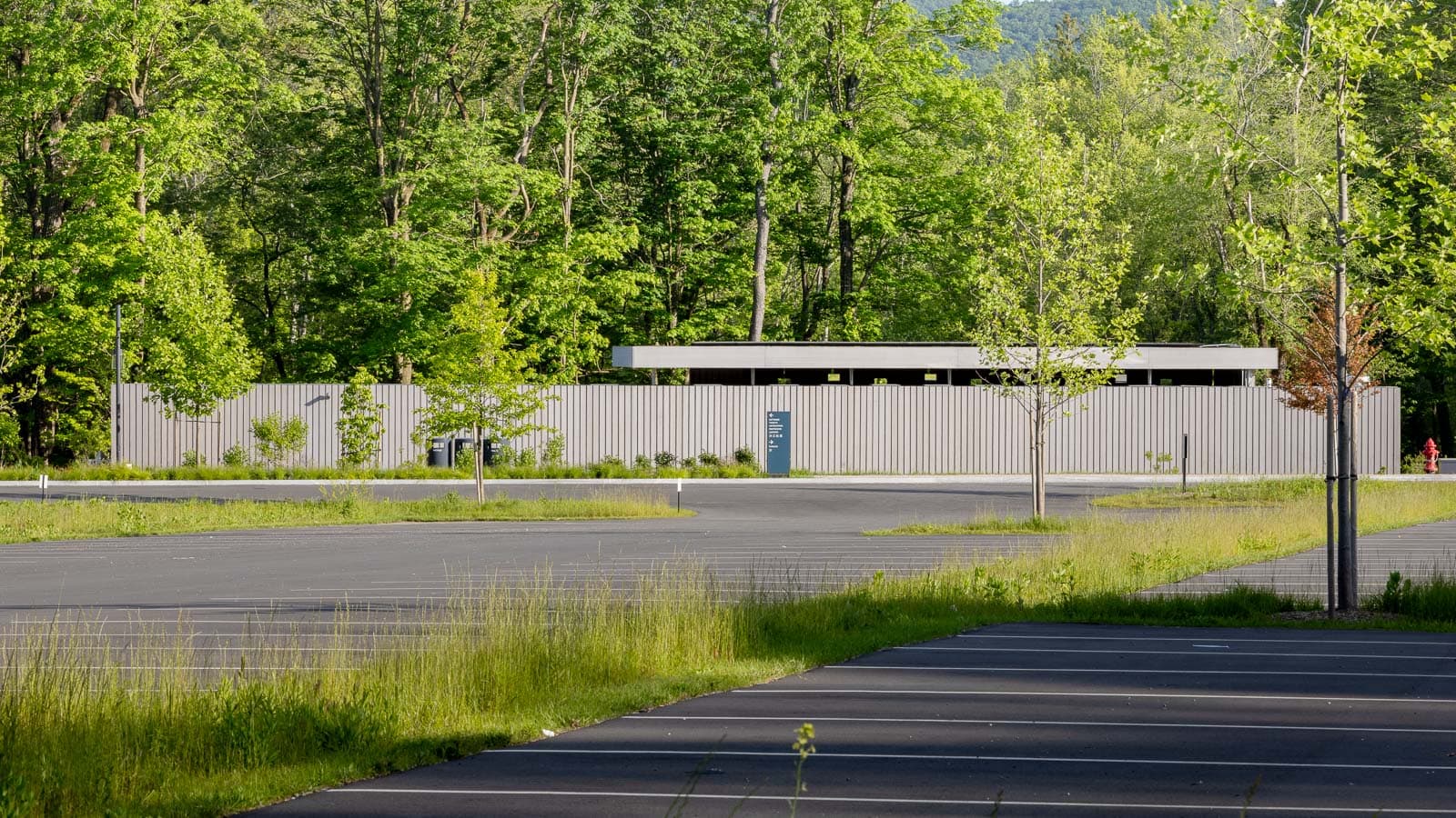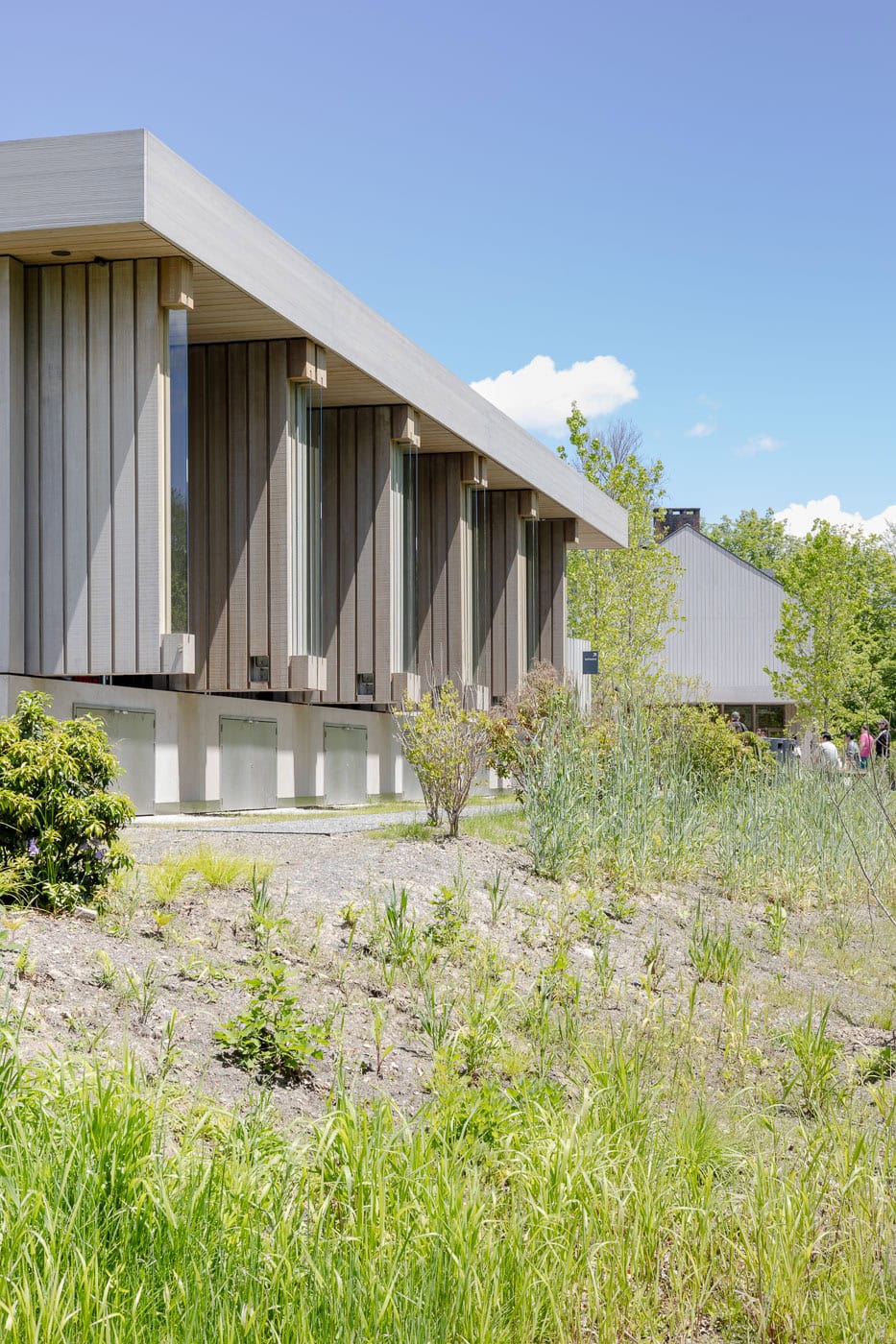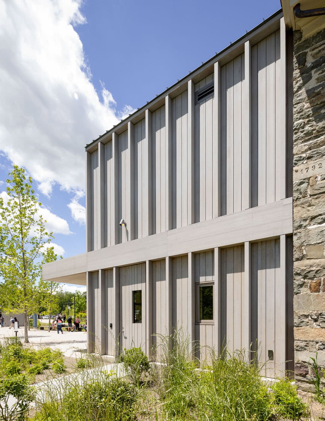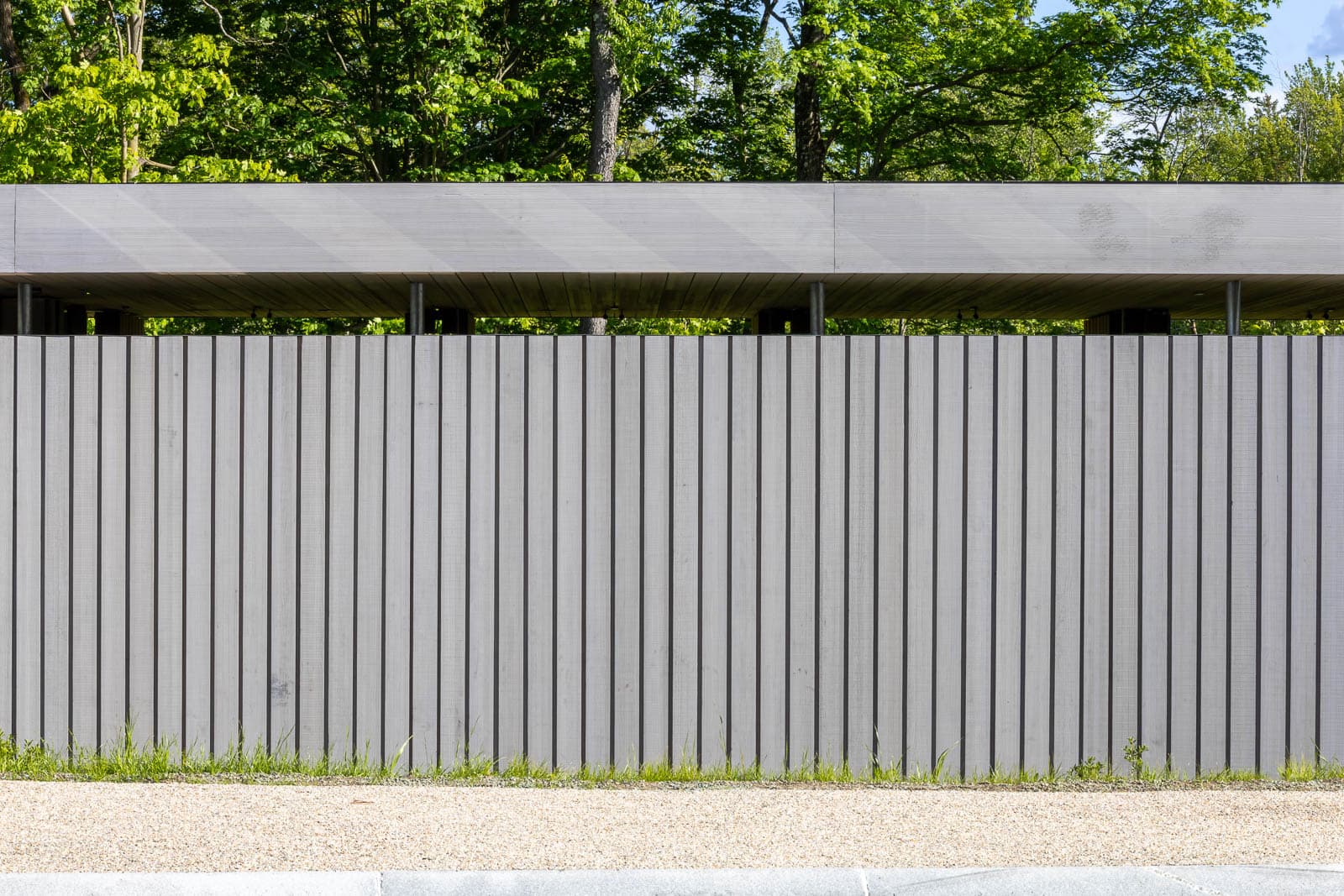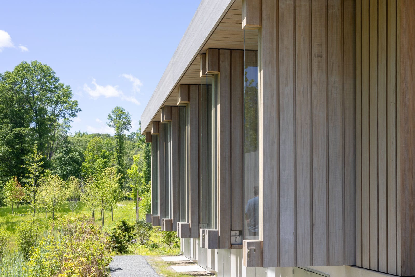 The two Welcome pavilions are clad with thermally modified timber planks. Front was involved in extensive timber research to determine the best product for use, studying species, treatments, and finishes that are best suited for Storm King’s particular environment. Adhering to the thermal performance requirements, which necessitated the wall build-up to perform at a very high level, a series of thermal analyses were run to determine the wall build-ups that met the project requirements. The façade system for the CFM building consists of insulated metal panels with corrugated metal cladding outboard, providing a very uniform rhythm to the large façade. The cladding panels are interrupted by large overhead doors. The roof is a TPO system with skylights that bring natural light into the large workspace. Front’s scope for the CFM building includes the insulated metal panel with custom cladding, large overhead doors, TPO roof, aluminum window system, custom overclad doors, and skylights.
